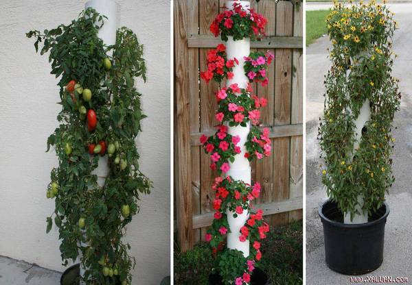 1. Bạn có thể tận dụng những ống nhựa PVC và khoan những lổ tròn lớn trên thân ống để làm nên những chậu cây theo chiều đứng.