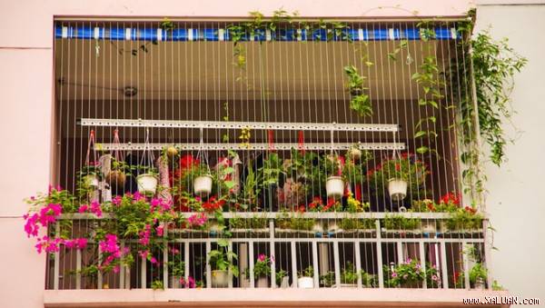 Ban công căn chung cư tầng 5 của chị Hoàng Hằng (quận Nam Từ Liêm, Hà Nội) luôn khiến người qua đường phải ngước lên nhìn, hàng xóm muốn lên tận nơi xem. Ban công có diện tích 5 m2, trồng đủ loại hoa như nhài, dạ yến thảo, hồng, sam, mười giờ, mai hoàng yến, mẫu tử, bông bụt, lan...