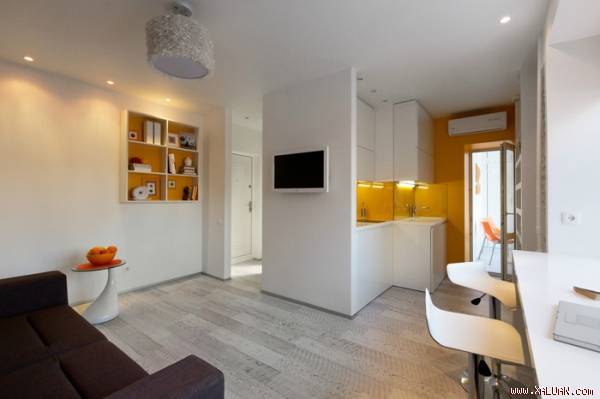 Không gian chỉ với khoảng diện tích bằng một phòng chức năng thông thường nhưng căn hộ vẫn mang lại cho mọi người cảm giác dễ chịu nhất có thể với đủ đầy tất cả các khu vực phục vụ cho cuộc sống hàng ngày. Lối vào nhà của căn hộ nhỏ chỉ chiếm diện tích không đáng kể nhưng được sắp xếp khá đơn giản và gọn gàng từ nội thất đến màu sắc.